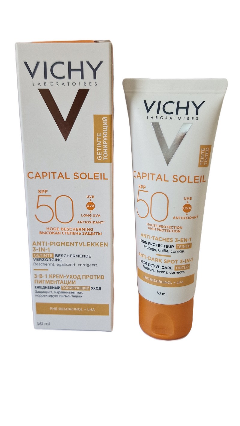Vichy Idéal Soleil krém proti tmavým skvrnám SPF 50+ 50 ml. Tónovaná péče proti pigmentovým skvrnám 3 v 1. Nemastný finiš. Velmi vysoká ochrana.Tmavé skvrny v obličeji trápí tisíce lidí. Krém Anti Dark Spot od Vichy napomáhá ke sjednocování tónu pleti a chrání pokožku obličeje, krku a dekoltu proti spálení v důsledku vystavení slunečnímu záření. Má vysoký ochranný faktor SPF 50+, hodí se proto nejen pro běžné použití při výskytu na slunci, ale i na cílené opalování. Již při prvním použití lze zaznamenat viditelné výsledky ve sjednocování tónu pleti. Pravidelnou aplikací poté dochází k postupné korekci tmavých skvrn a krém působí také preventivně proti tvorbě nových pleťových nerovností. Svou nemastnou texturou je vhodný pro každodenní použití u všech typů pleti.